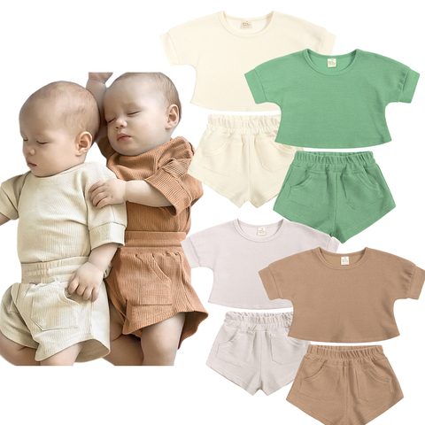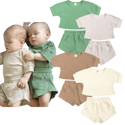 2025年夏キッズ服セットワッフルコットン半袖tシャツドロップショルダーショートスキッドカラー幼児女の子服